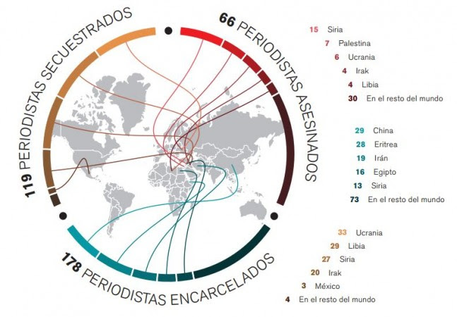 Entre los países con más periodistas detenidos en 2014, Venezuela ocupa el quinto lugar con 34 casos registrados. Por encima de Venezuela en esta categoría se encuentran Ucrania, Egipto, Irán y Nepal.